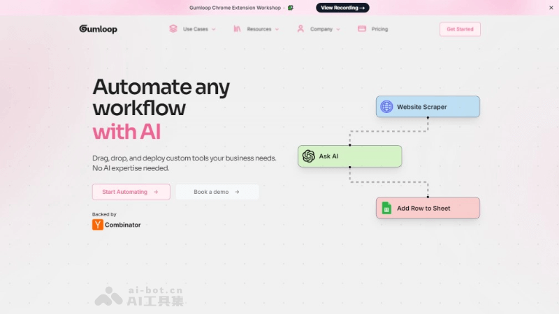 Gumloop是AI零代码工作流平台,通过简单的拖放界面使用户能够创建和部署 AI 驱动的工作流自动化,无需编写代码。核心优势在于易用性和强大的 AI 功能,适合非技术用户快速上手,设计和实施复杂的自动化流程。Gumloop 提供了预定义的自动化模板,支持与多个流行服务的连接,如 Twitter、AWS、GitHub、Outlook、Google 等,支持用户自定义工作流程。Gumloop 提供了 Chrome 扩展程序,用于构建 AI 浏览器自动化。